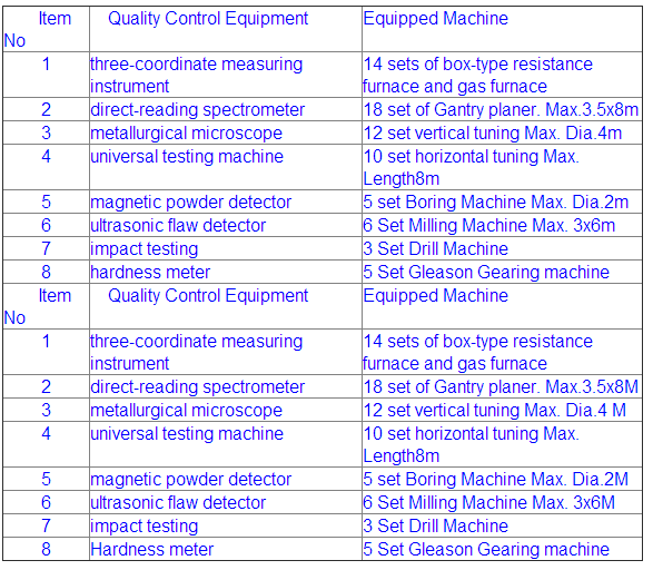 為了保障產物品德,相干的品德節制裝備是條件。翼凱機器配有三坐標丈量儀、直讀光譜儀、金相顯微鏡、全能實驗機、磁粉探傷儀、超聲波探傷儀、打擊實驗機等檢測裝備。 公司還具有無機樹脂硅酸鈉自凝砂、二氧化碳硅酸鈉砂四條出產線,14臺箱式電阻爐、煤氣爐。車間各種起重裝備180余臺,金屬加工裝備200余臺,此中3.5mx8 m龍門刨床、最大4米立式車床等大型裝備40臺。
